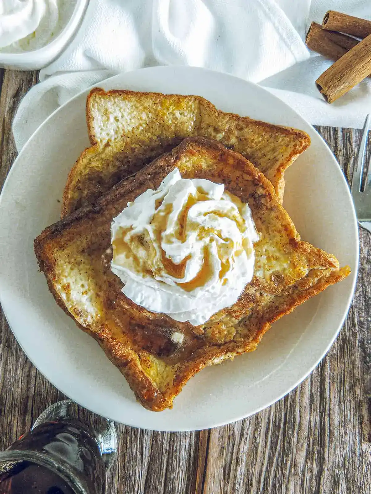 This recipe transforms the classic French toast into a decadent treat, perfect for a lavish breakfast or brunch. Top with whipped cream, syrup and/or fresh fruit to make it perfect.
