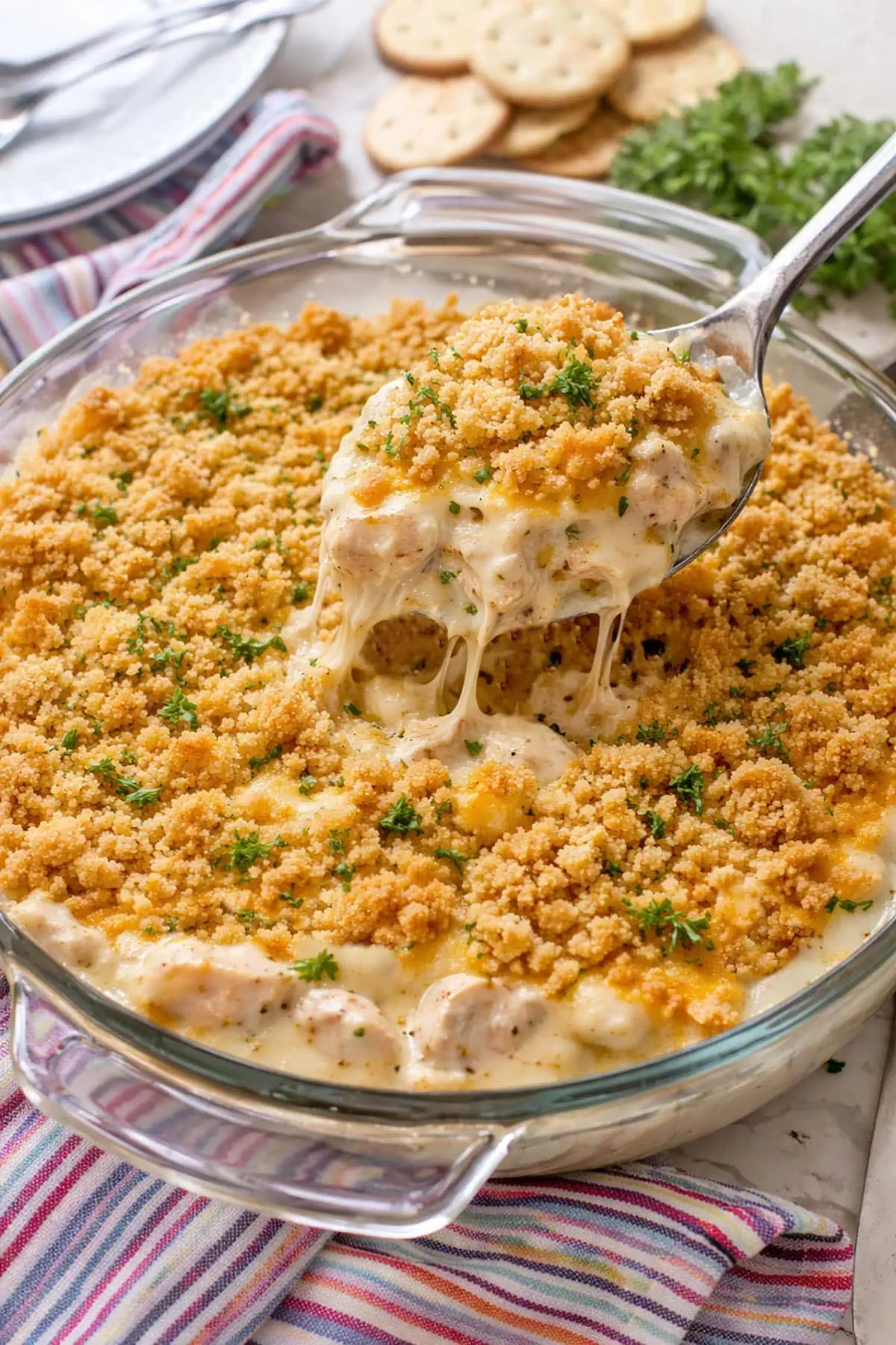 Forgo the cracker topping and instead top with cheddar cheese. I love to add shredded cheese on the top to add a gooey cheesy comfort food twist.