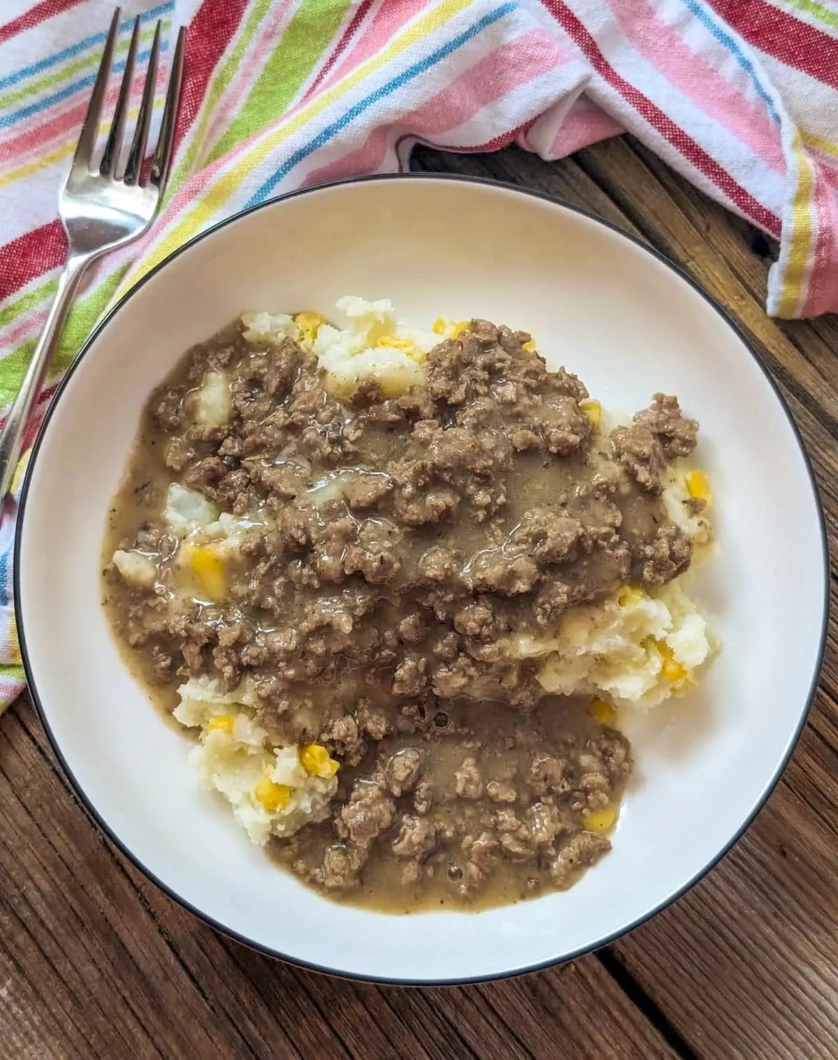 It’s ground beef, a glossy gravy, over yummy mashed potatoes. Not fancy. It’s not ‘instagrammable’ in that annoying way.