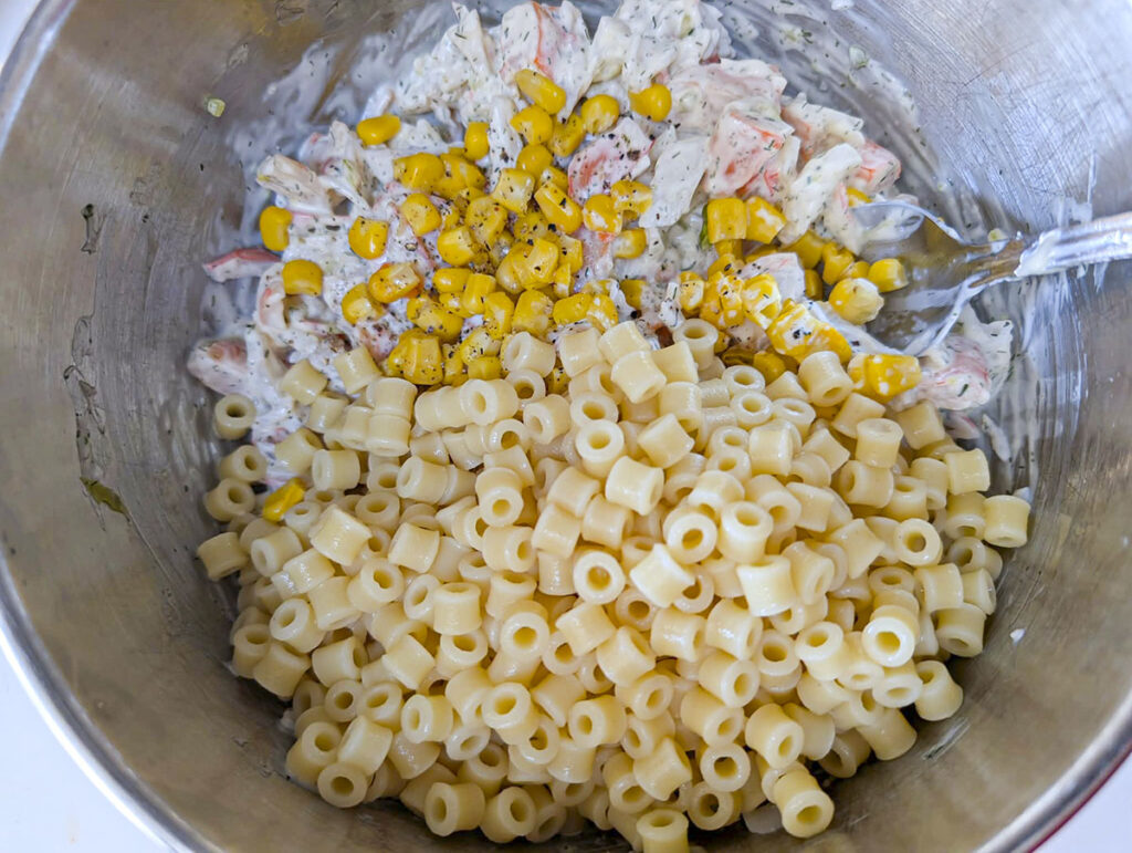 - Add the cooled pasta and corn (if using). Gently fold everything together until well mixed.