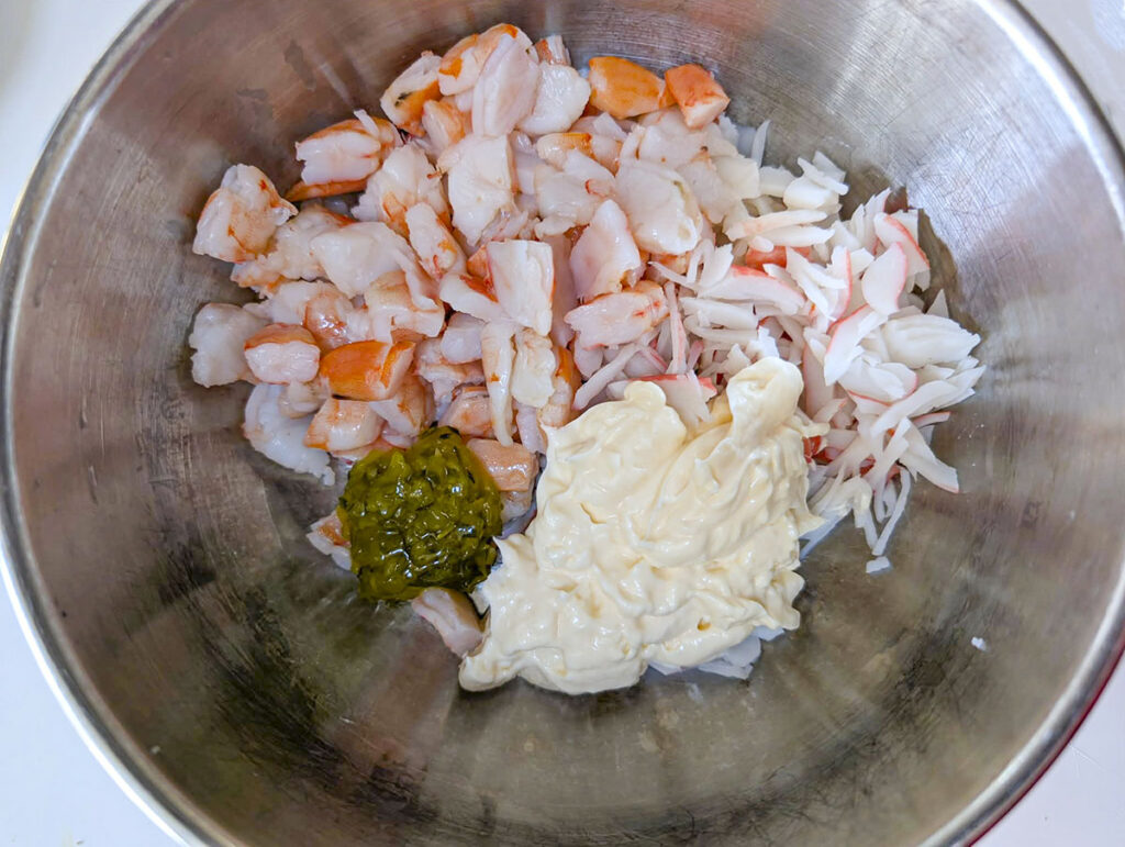 - In a large bowl, combine the chopped shrimp, imitation crab, mayonnaise, and sweet relish. Stir until the seafood is evenly coated.